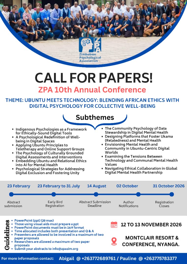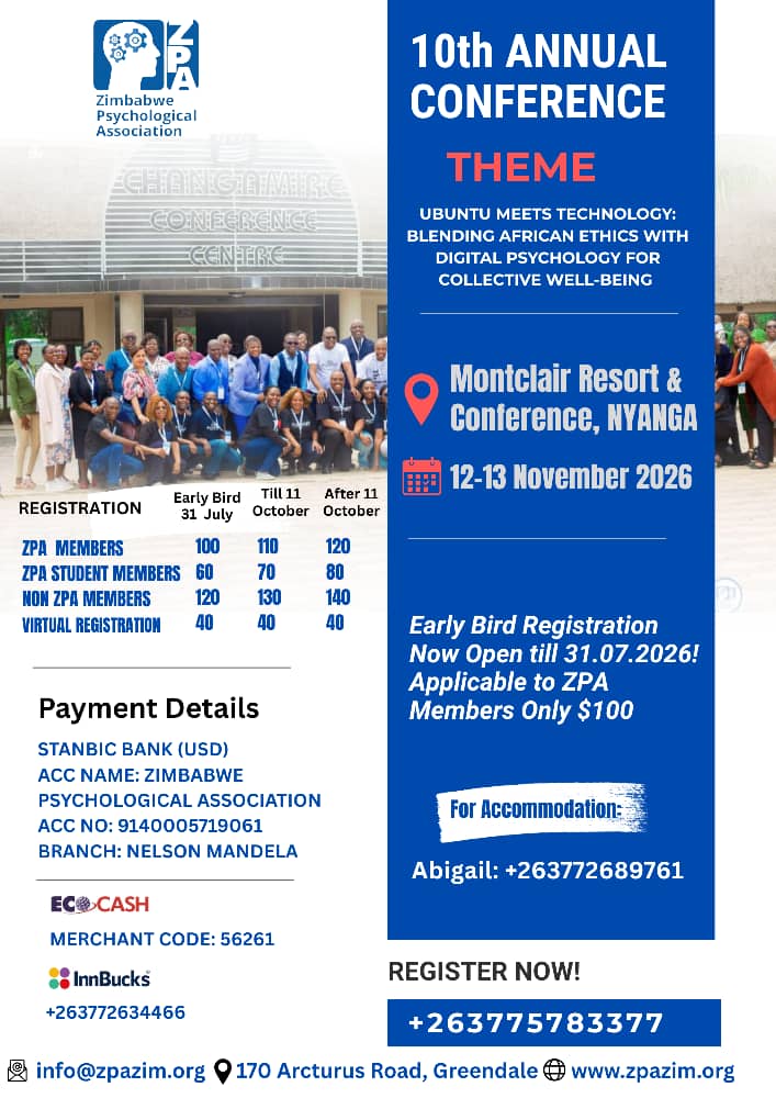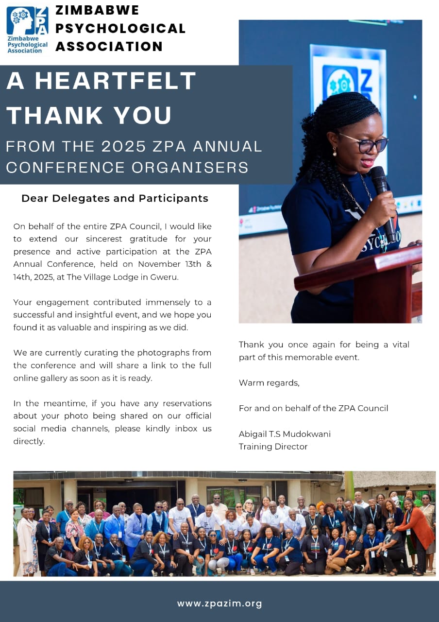 As President of the Zimbabwe Psychological Association, I am proud to affirm our commitment to working alongside communities in advancing psychology as a science and profession dedicated to promoting human well-being and social justice. Our Association serves as the unified voice for psychology professionals, upholding ethical standards while advocating for both our members and the public they serve. Through continuous professional development, research partnerships, and knowledge-sharing platforms, we actively collaborate with community members, traditional leaders, healthcare providers, and policymakers to influence mental health policy and address social challenges. Our collaborative approach recognizes that meaningful progress in mental health can only be achieved when we work in genuine partnership with the communities we serve, ensuring psychological services are accessible, culturally relevant, and effective in fostering the collective well-being of all Zimbabweans.